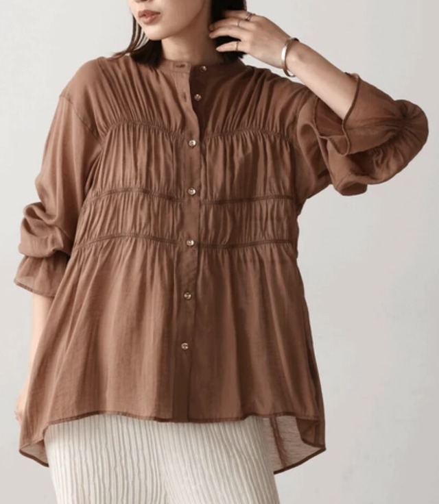 ◆素材:ポリエステル 100% ◆FREE:着丈 74.5/77cm バスト 90cm 肩幅 51cm 袖丈 53.5cm 上品なツヤ感が魅力の、ギャザー付きブラウス。 胸元のギャザーと袖に施したギャザーが立体感を演出し1枚で 着映えするデザイン。 光の加減でさりげなく輝き、上品な華やかさをプラス。 さらっと涼しく着れます。