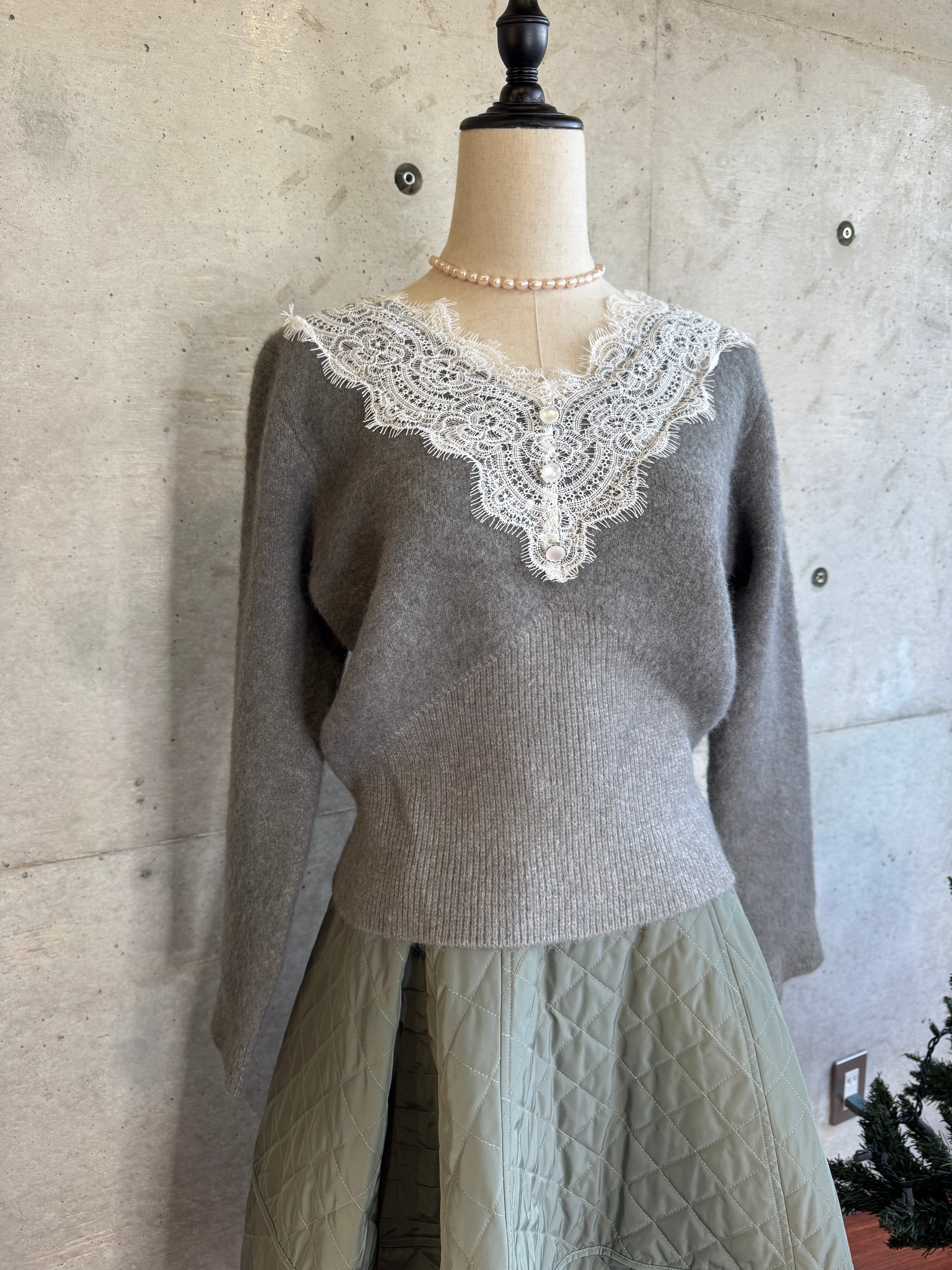 Vネックフラワーレースニット
