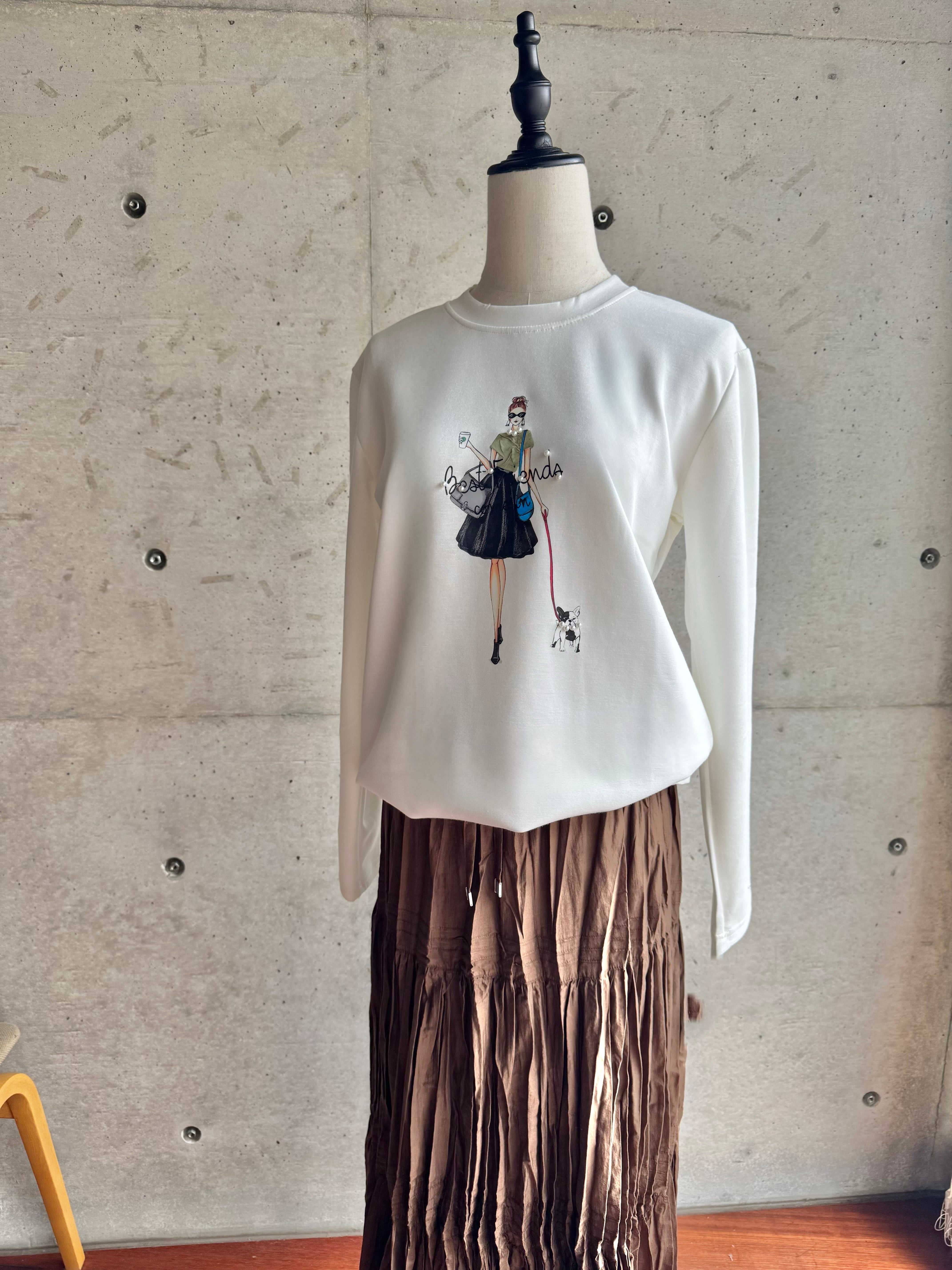 パールビジュー飾りドールプリントカットソー
